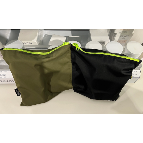 Double sided with two water repellent zip compartments. Hidden magnets allow for a sleek closure when folded over.